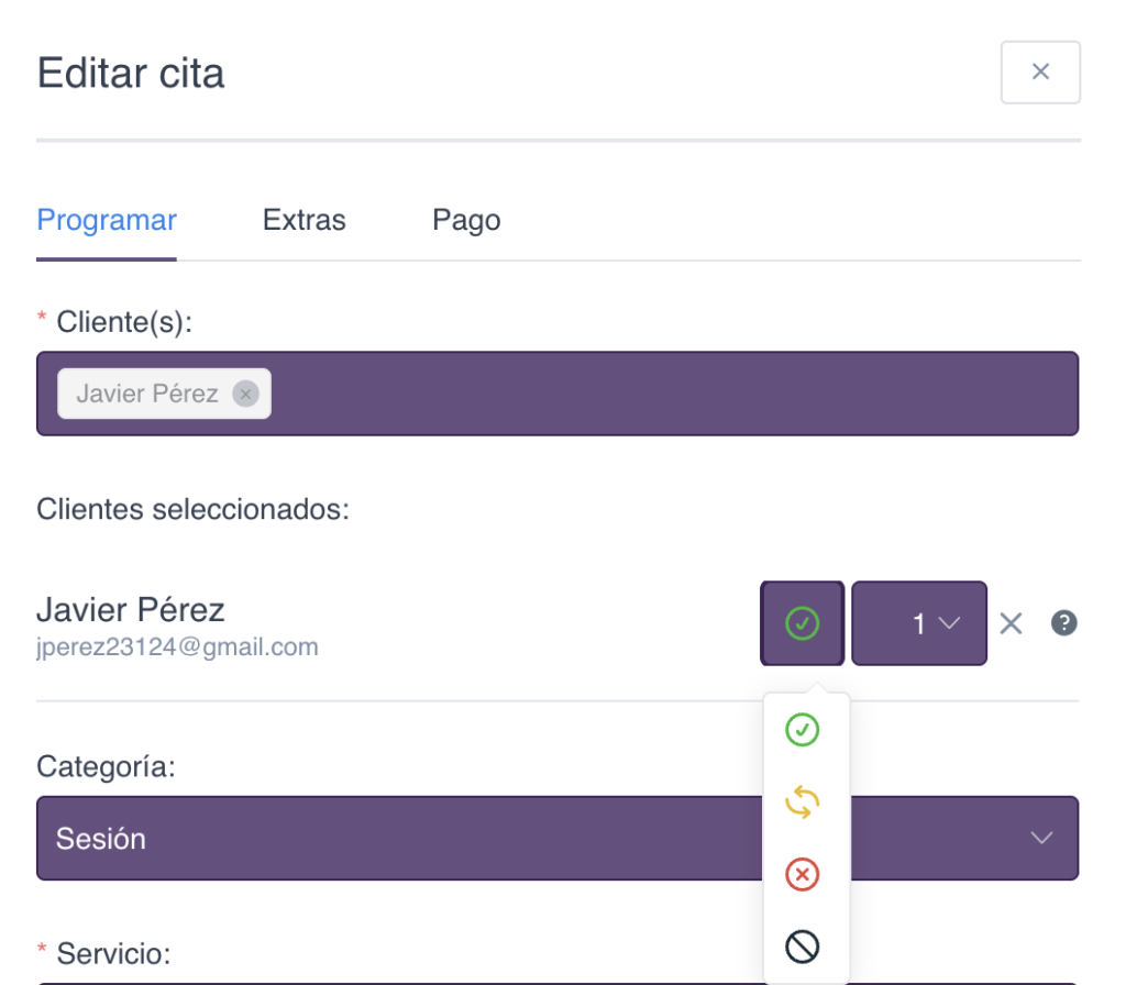 - Estado de la cita (pendiente, confirmada, cancelada, etc.).