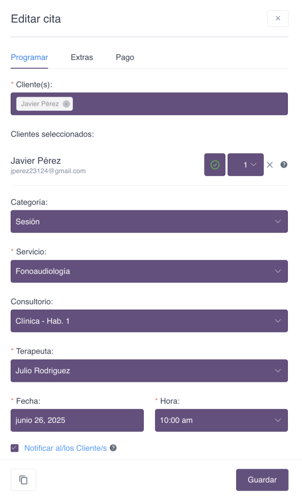 - Seleccioná paciente, terapeuta, servicio, lugar, fecha y hora.