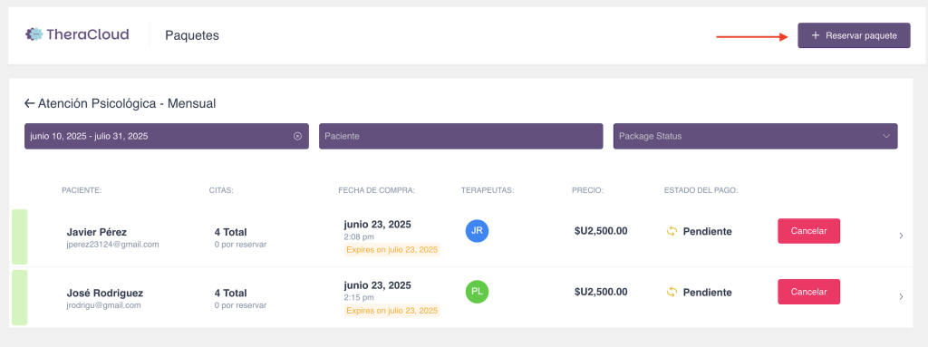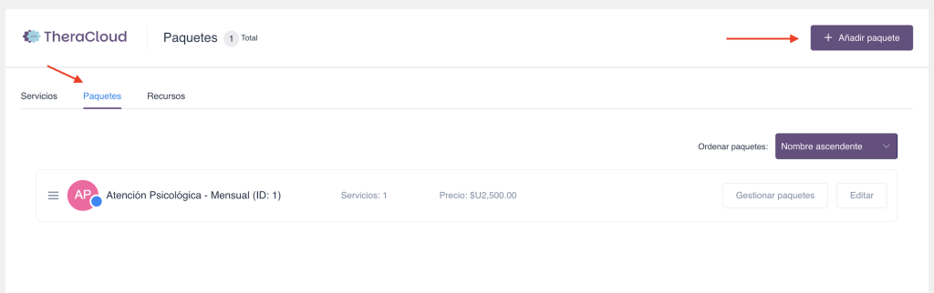Los paquetes son un recurso que sirve para reservar varias sesiones a un paciente por mes y poder asignarle un precio fijo.