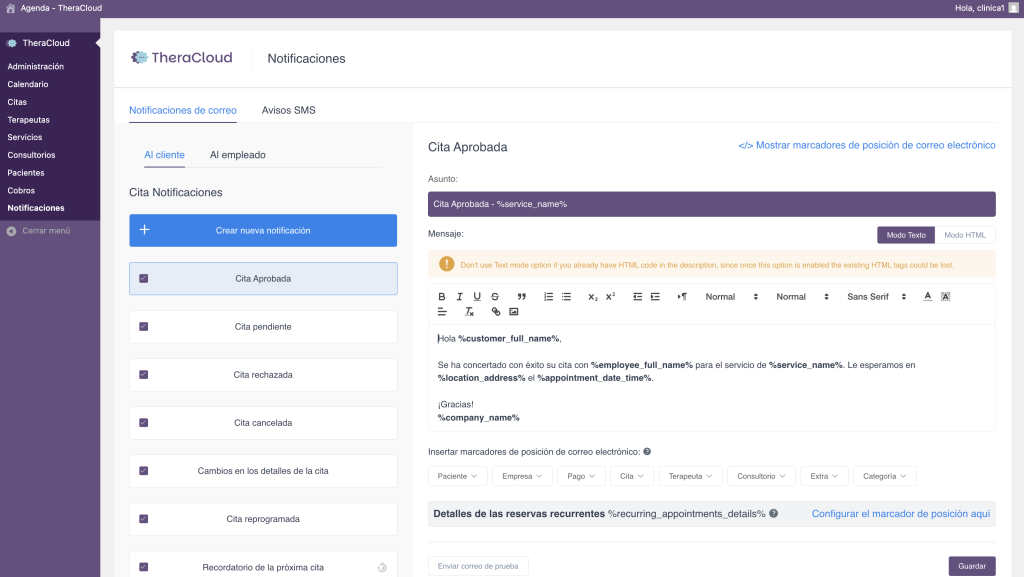 - Personalización de mensajes para recordatorios y confirmaciones.