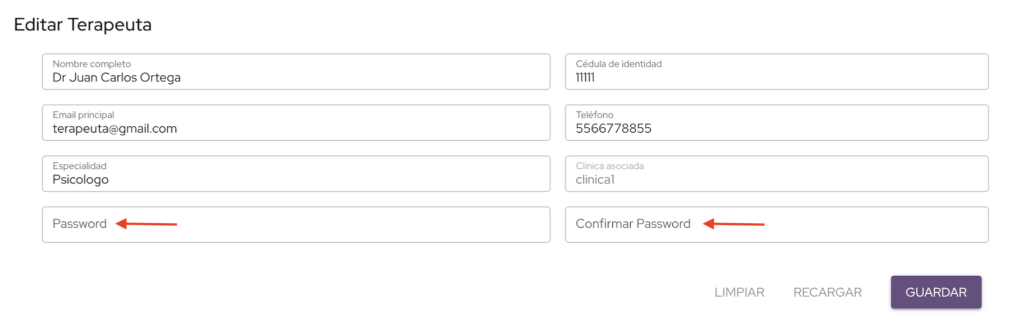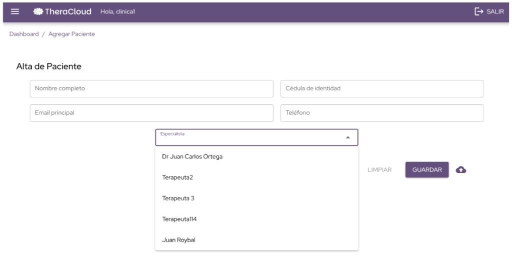 Dentro de esos campos podrás asignar el paciente a un terapeuta específico.