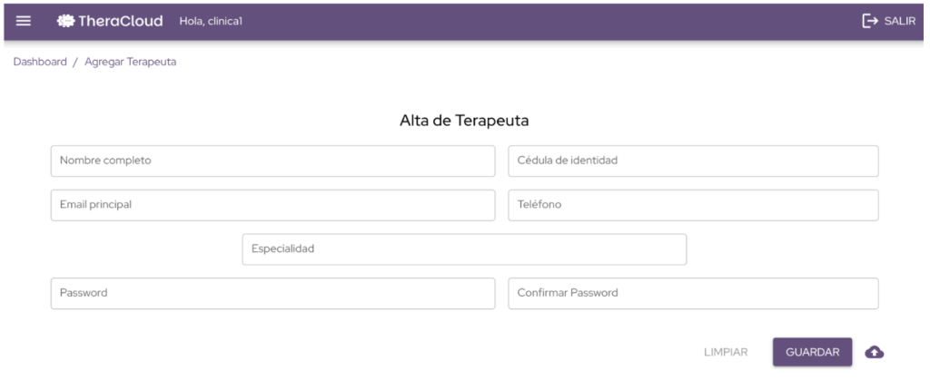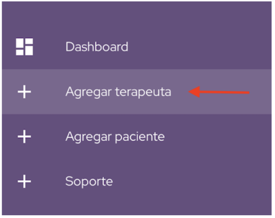 En el menú de la izquierda podrán encontrar un botón que dice “Agregar terapeuta”. El mismo los direcciona a una serie de campos para agregar la información del nuevo terapeuta.