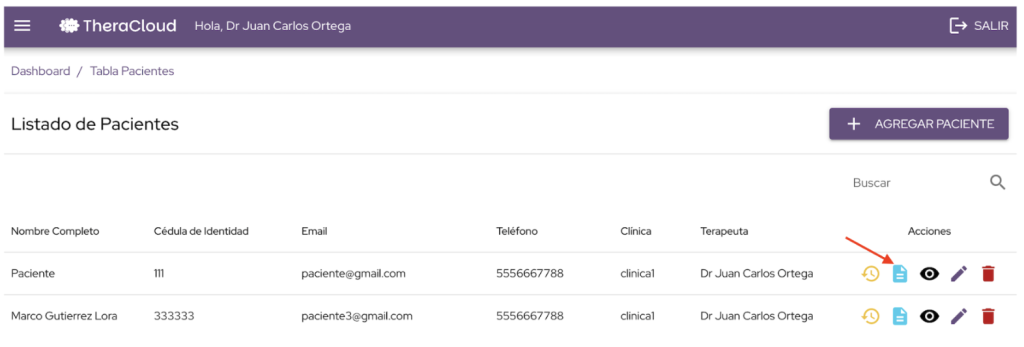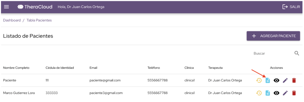 En tu lista de pacientes, encontrarás un botón celeste a la derecha con un ícono de informe: