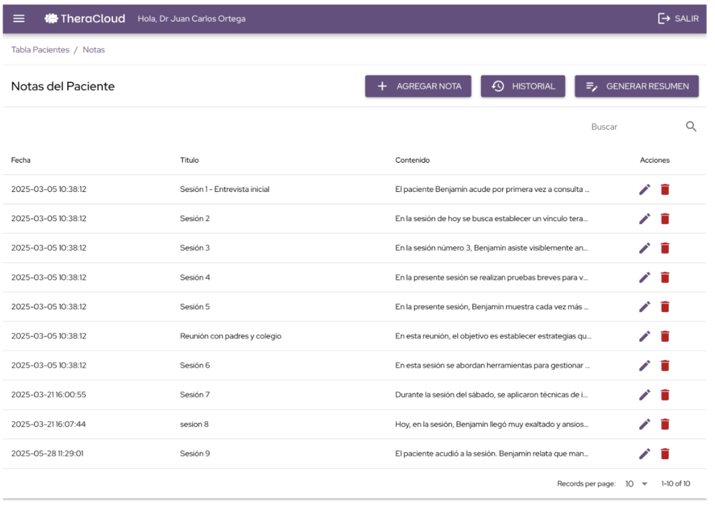 Haz clic en ese botón para ver todas las sesiones realizadas con tu paciente en el pasado. Puedes volver a editarlas si lo necesitas.