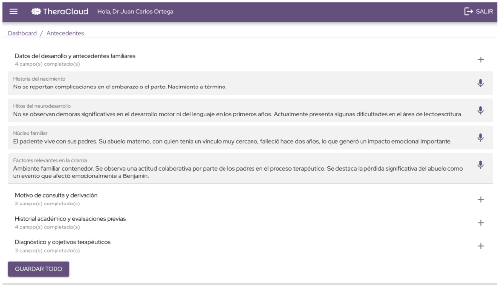 Una vez ingreses en la sección de antecedentes, podrás cargar la información del paciente de forma escrita o dictada.