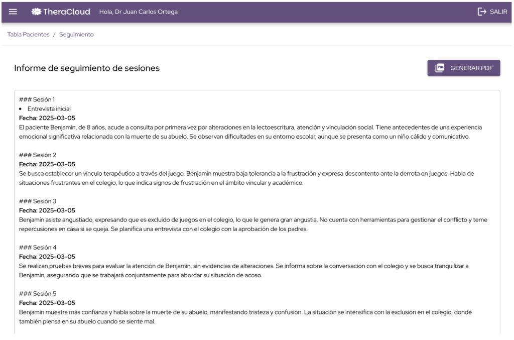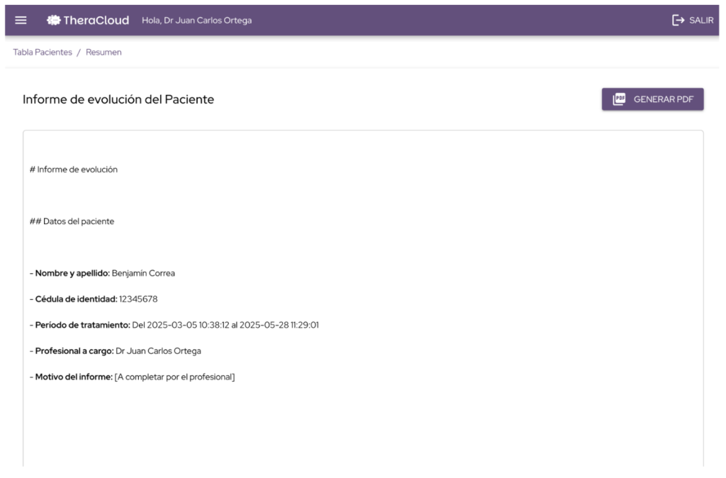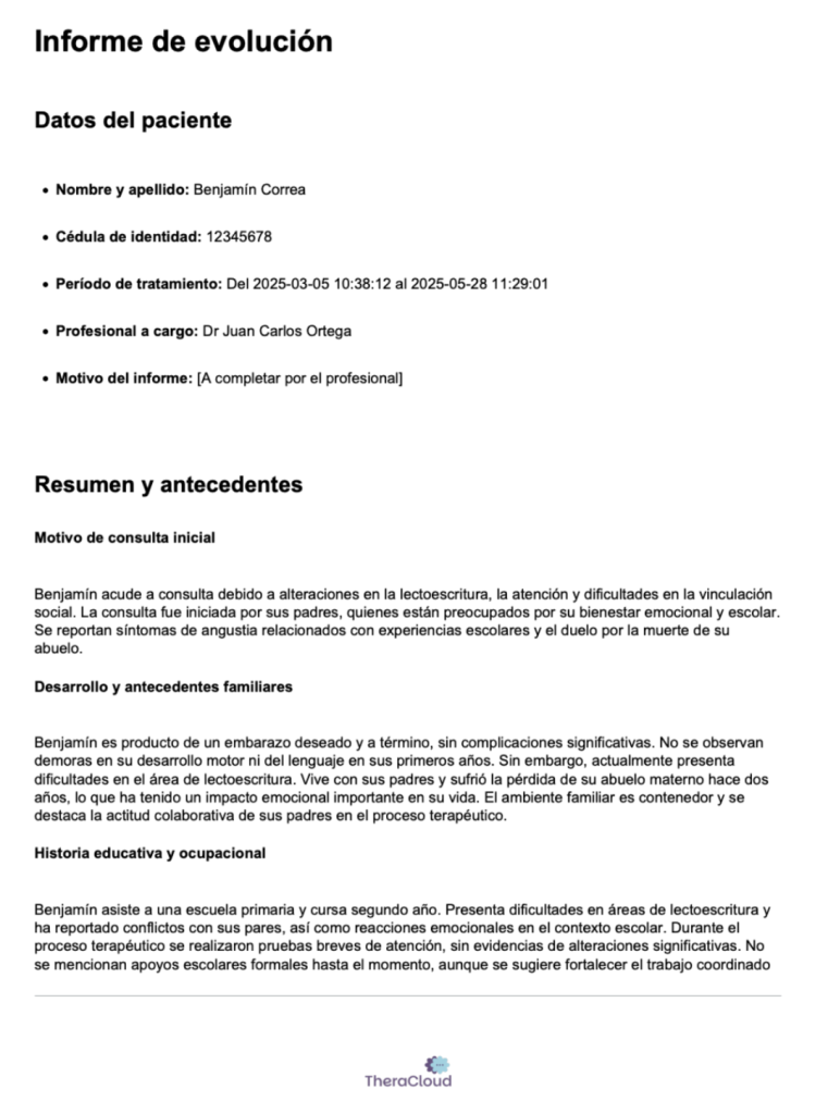 Ese botón hará que la Inteligencia Artificial recopile toda la información histórica de tu paciente, tanto de sus antecedentes como de las sesiones registradas, y genere un informe editable. Este proceso puede demorar unos segundos, dependiendo de la cantidad de información que tenga cargada tu paciente.