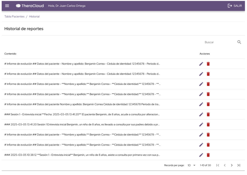 Dentro de la sección “Historial” podrás encontrar todos los informes generados en el pasado sobre tu paciente para volver a editarlos o descargarlos: